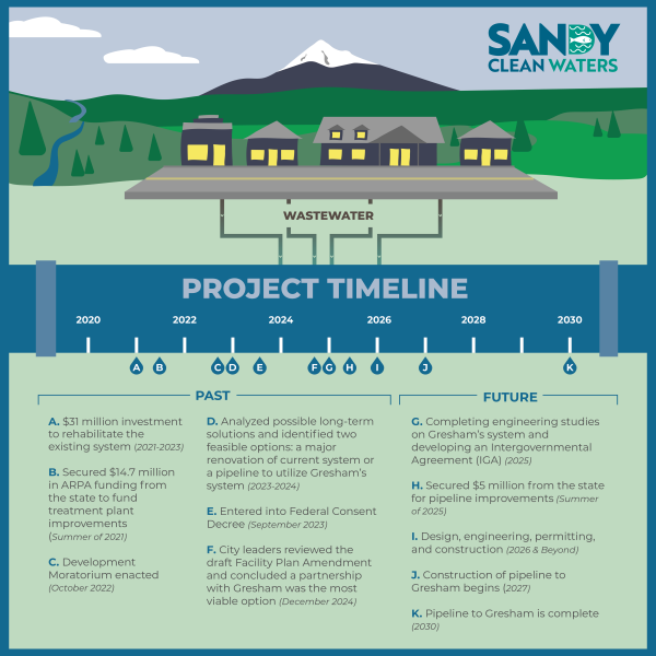 The City of Sandy is moving forward with a comprehensive approach for how we handle our wastewater. Interim fixes have put off this decision, but further delay is not an option under a federal consent decree, especially with the escalating impact of our system’s problems on local residents and businesses.