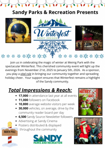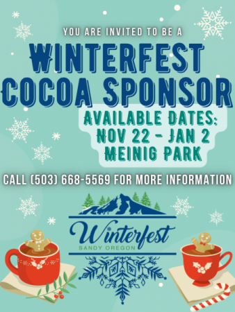 From Nov 22nd - Jan 2nd you have the opportunity to hand out free hot cocoa to anyone enjoying the lights in Meinig Park. This is your opportunity to meet people, get your business/organization name out there, and share chocolately holiday magic! To register as a Cocoa Sponsor fill out the Sponsor Application (downloadable at the bottom of this web-page) and return to the Sandy Community and Senior Center.
